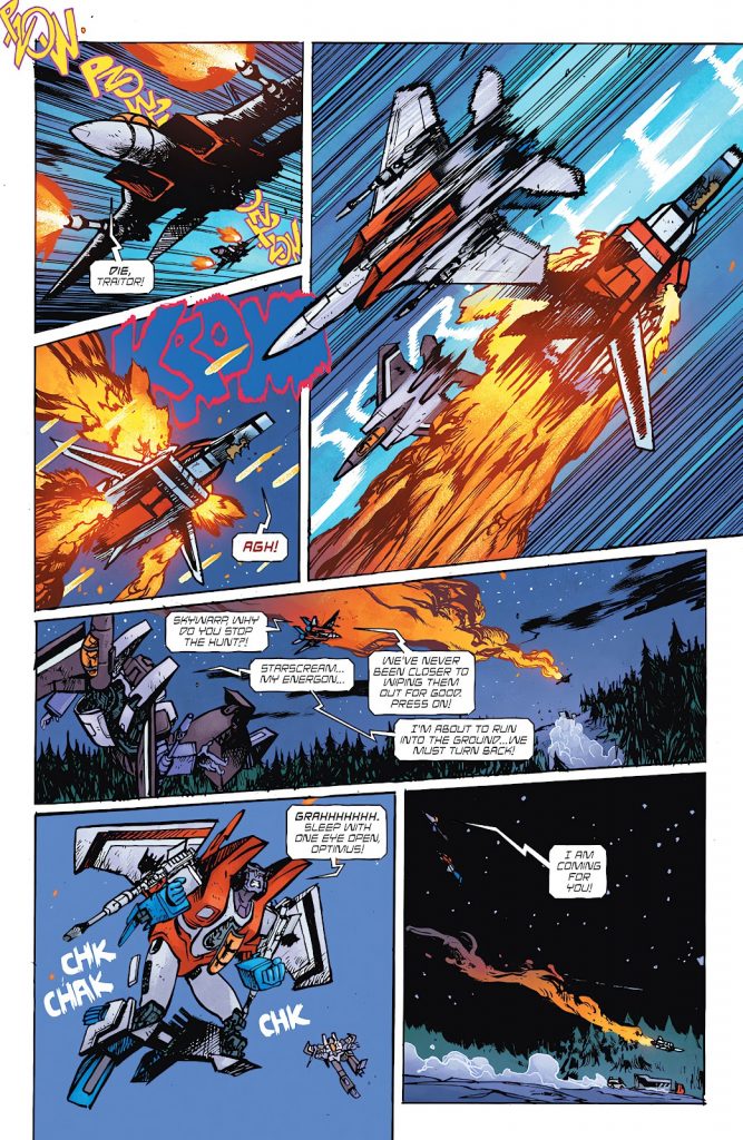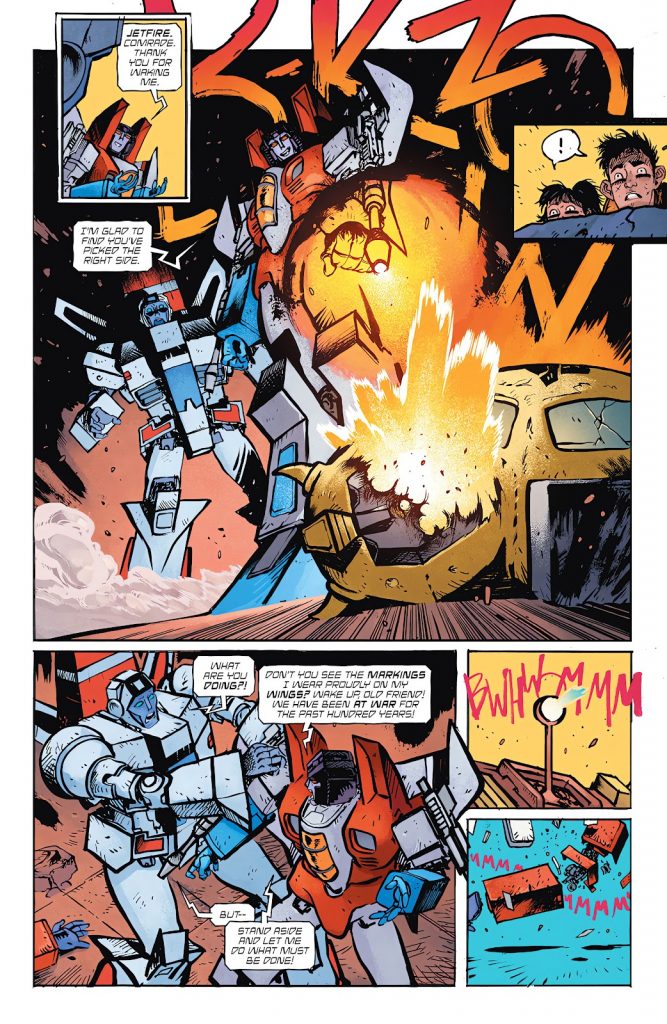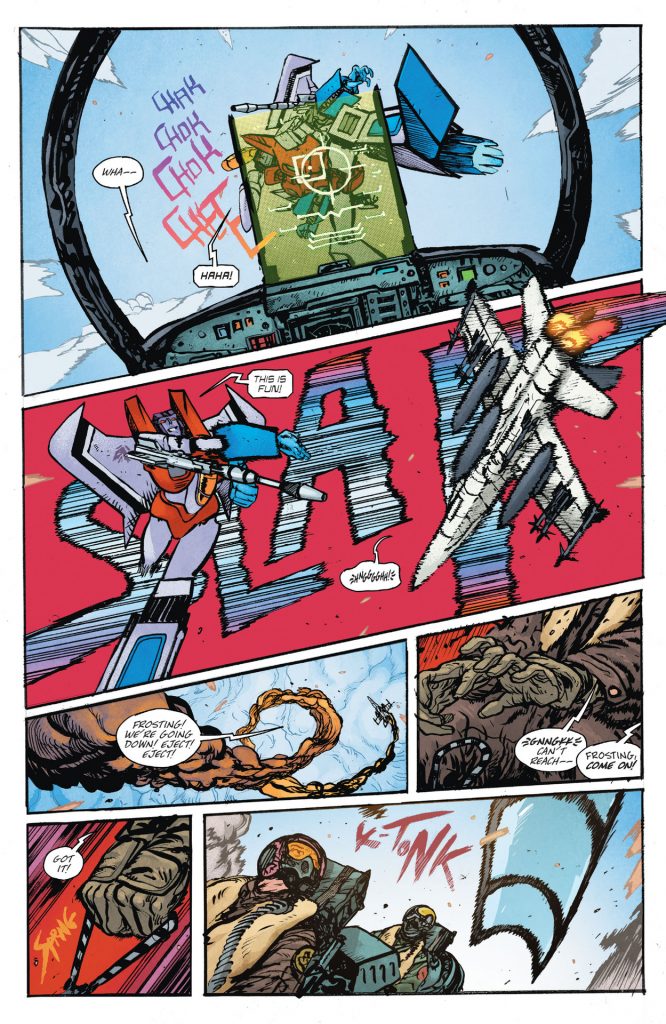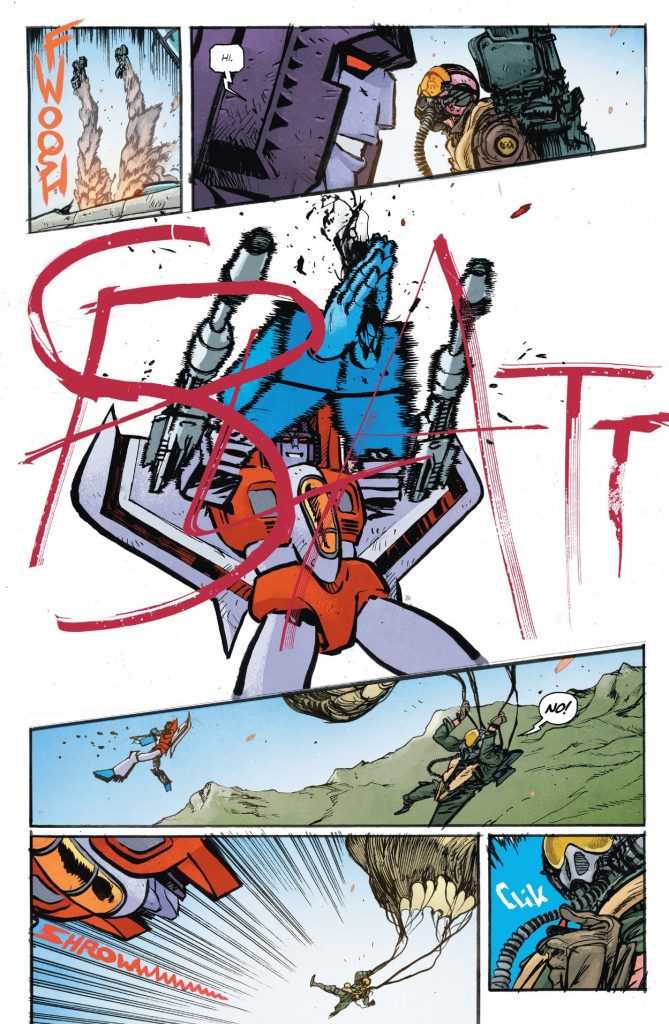 Pero llega la caballería. Un avión de combate que iba de viaje de rutina ahora debe enfrentar esta amenaza… pero el piloto y su pasajero ni idea a lo que se van a enfrentar. Starscream acaba con un avión de un simple manotazo. Piloto y pasajero se ejectan justo a tiempo… o ese parece…