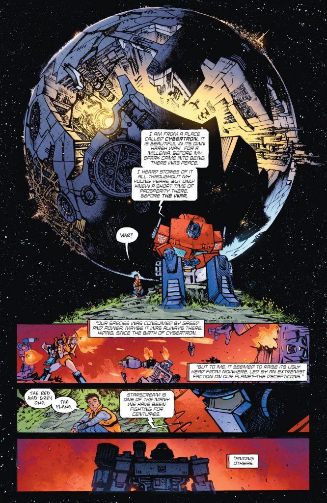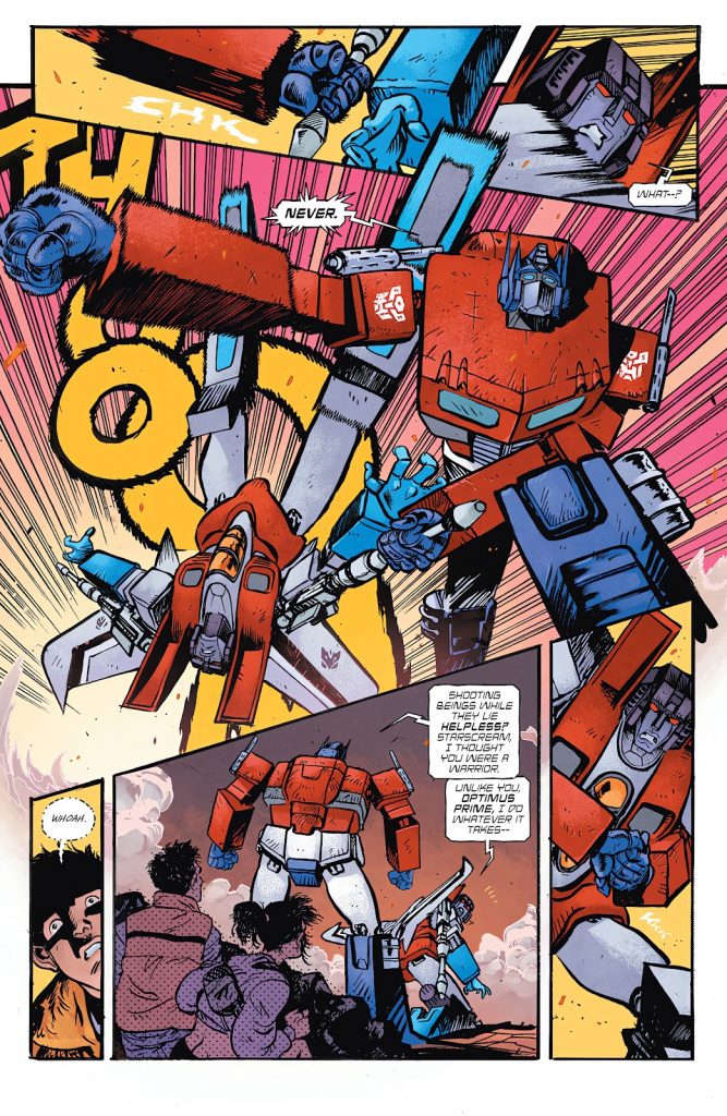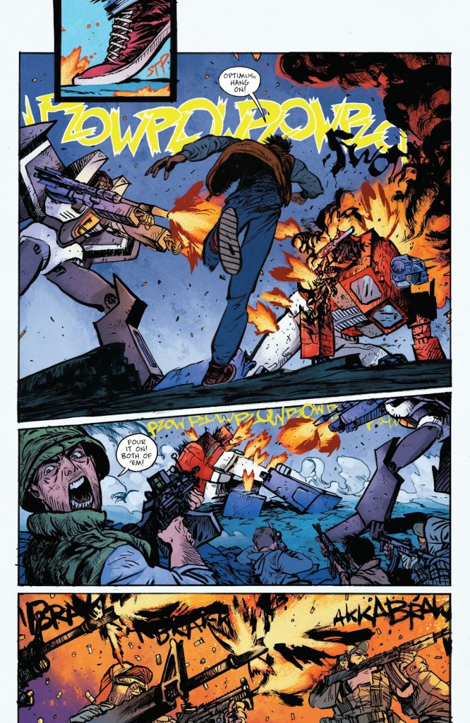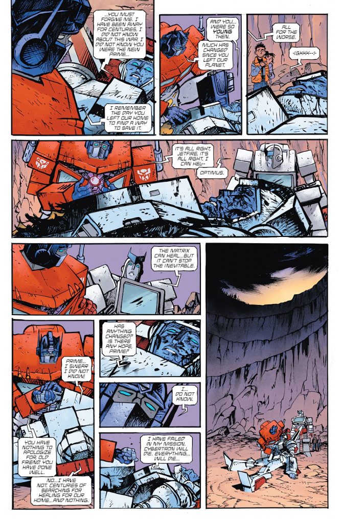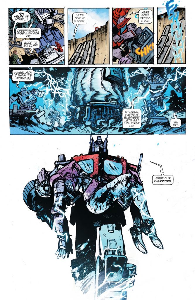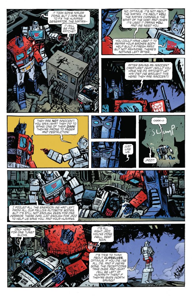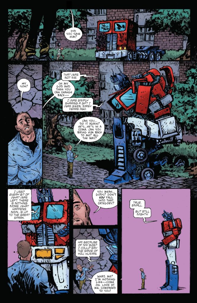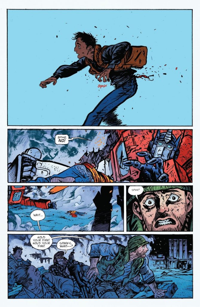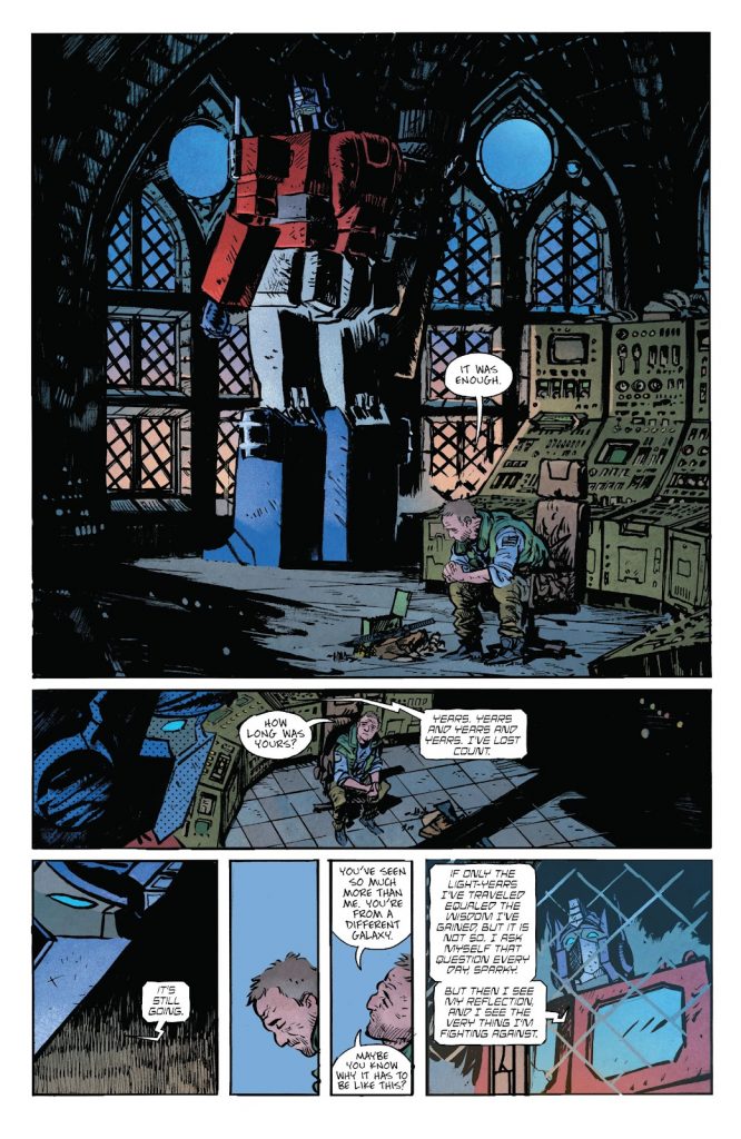 Optimus y Sparky toman un tiempo para charlar. Ambos son veternamos de horribles e interminables guerras. Ambos comparten el dolor de ver tantas muertes y se preguntan porqué tiene que ser así… ninguno de los dos tiene una respuesta.