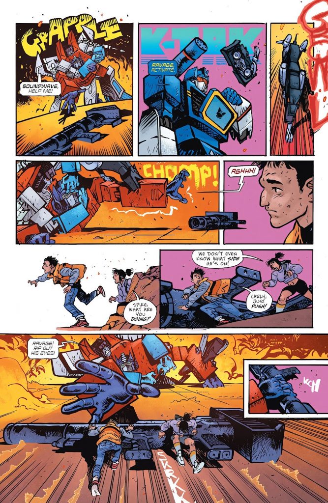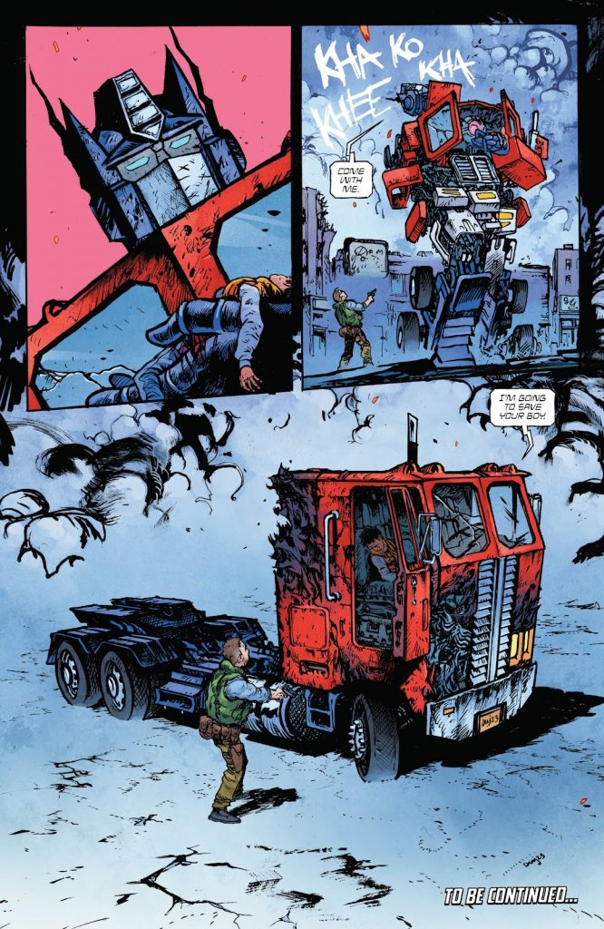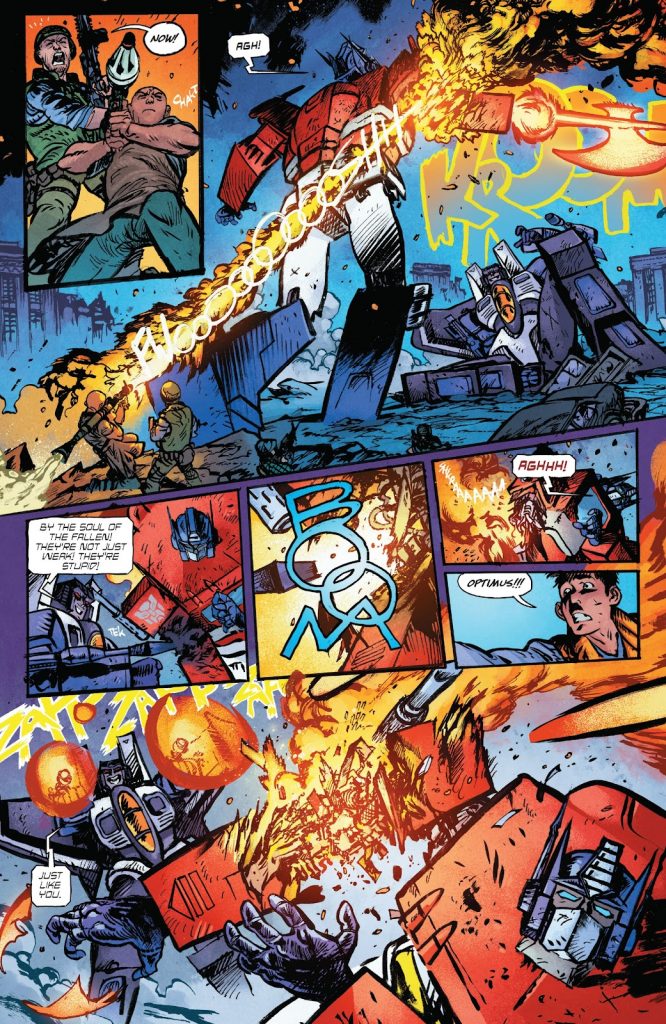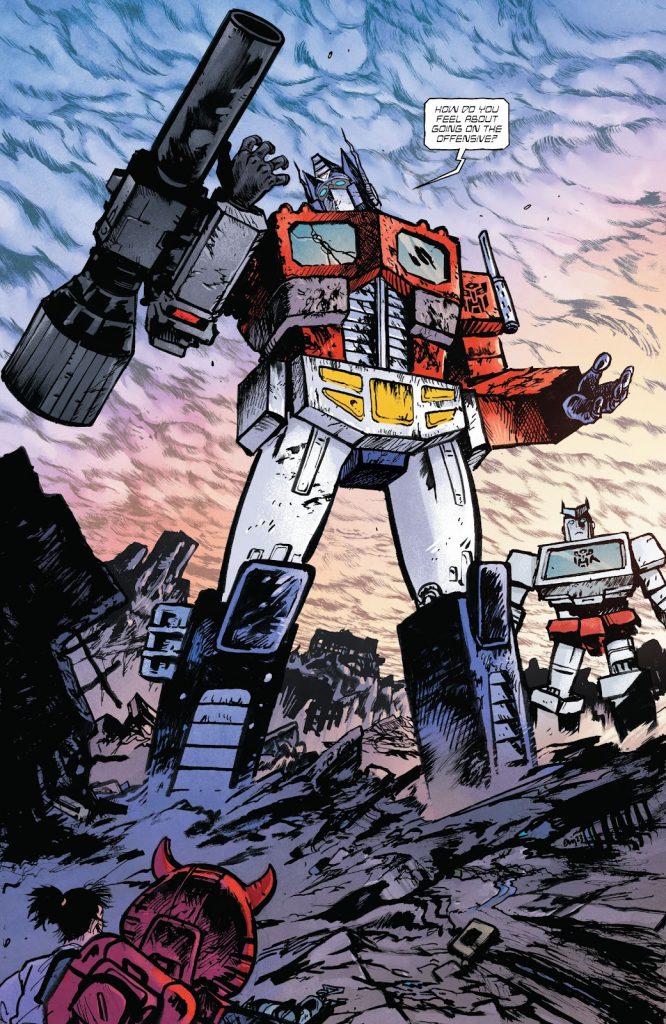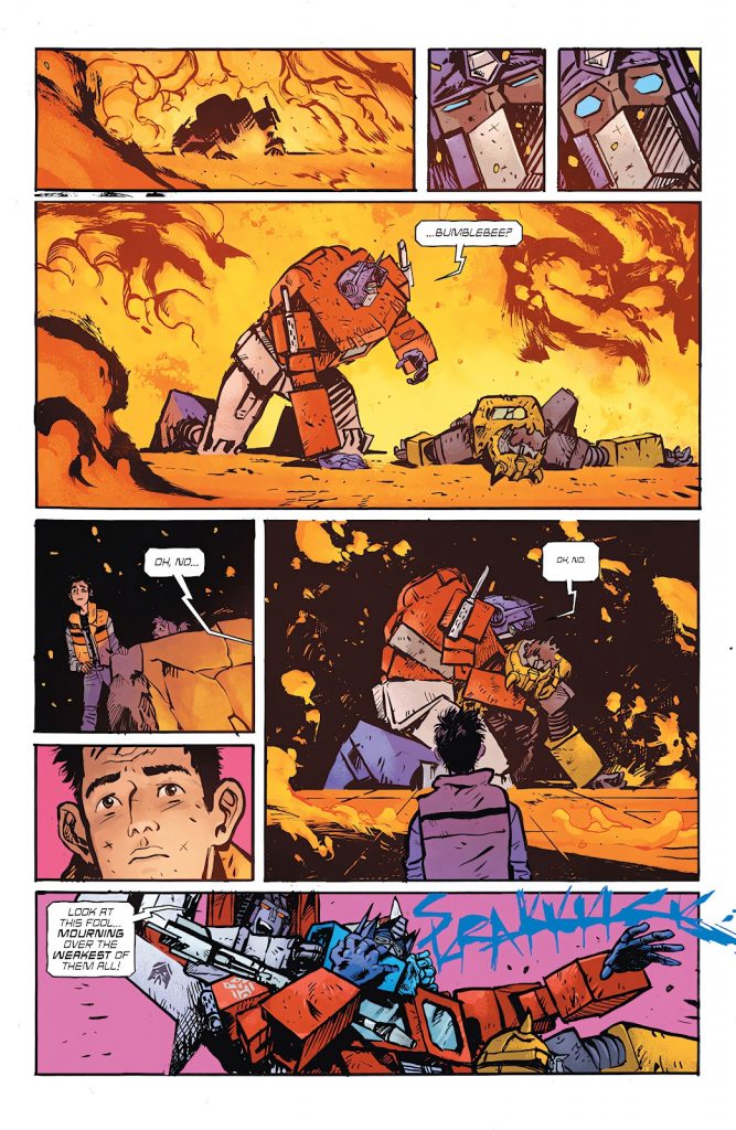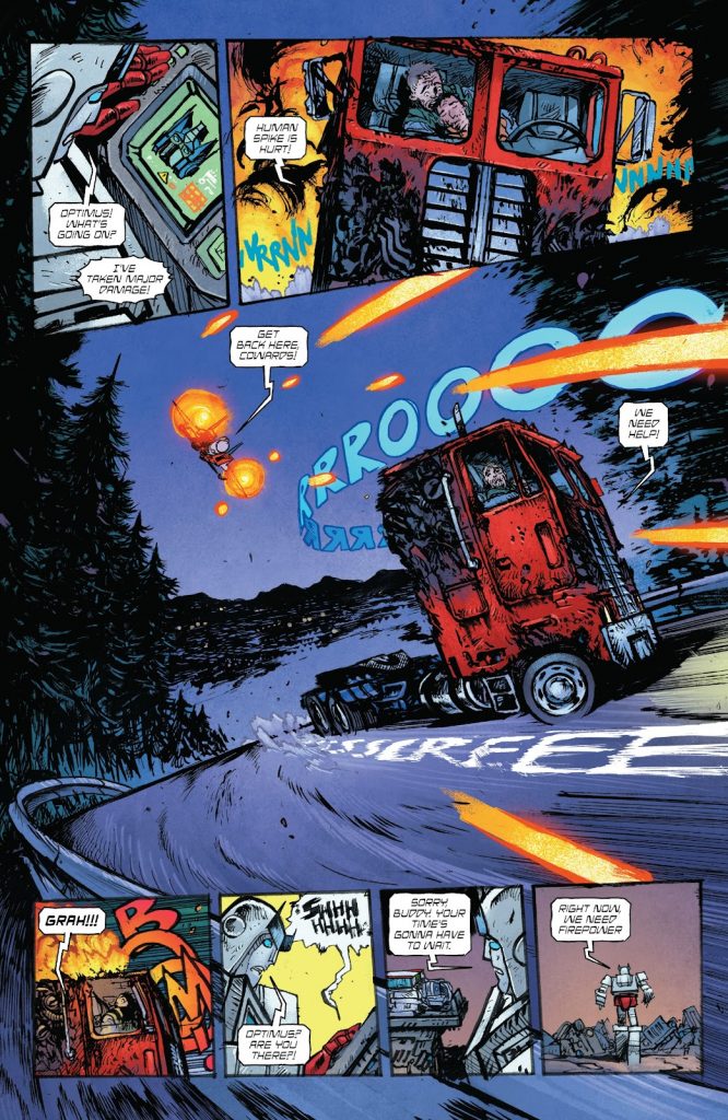 Teletraan-1 sigue reactivando Transformers sin distinción. Sólo Ratchet está activo para ayudar a Prime. En medio de la batalla, Optimus encuentra el cuerpo con la cabeza destrozada de Bumblebee, y el pobre Prime sufre en silencio. Esto descuido lo deja a manos de Starscream, Soundwave y Ravage. Prime está desarmado, pero en ese momento, Spike decide ayudarlo. Junto a Carly empujan el rifle de Optimus hasta su alcance.