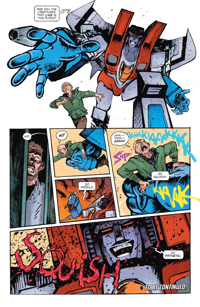 Starscream los nota. Davey trata de llegar a su carro pero Starscream lo captura…y se sorprende de lo frágiles y patéticas que son las formas de vida de la Tierra y ….