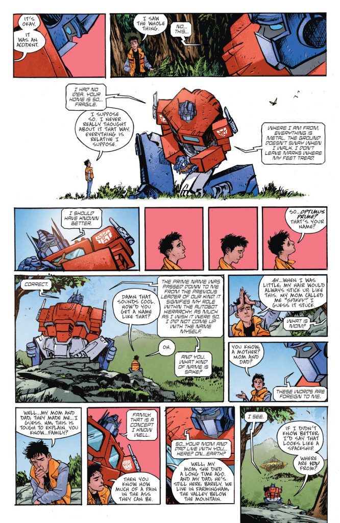 Llega un poco de paz para Optimus Prime. Queda fascianado con nuestro mundo orgánico, pero aprende lo frágiles que son sus habitantes al apachurrar sin querer a un ciervo. Prime se pone emo, pero Spike entiende que fue un accidente. Intercambian historias, y vemos que Cybertron había sido un lugar de paz hasta que la guerra empezó.