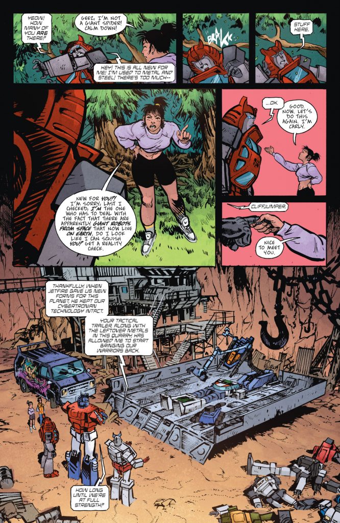 Su charla la interrumpe un reactivado Cliffjumper. El bajito está casi traumado por nuestro mundo orgánico, y le da asco todo lo que ve. Pero es Carly la que le hace ver que son ellos los extraños en nuestro mundo. Así empieza una extraña amistad entre ellos. Ratchet ha logrado usar el tráiler de Prime y los pocos recursos que tienen para reactivar a los restos de los Autobots que salvaron del arca.