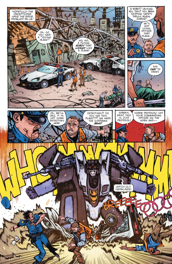 Por otro lado, la policía llega por fin a la planta de poder atacada por el “robot que se veía como un avión”. Los oficiales no toman muy en serio el asunto, y Sparky pide que venga el ejército cuando Skywarp y Soundwave llegan con Starscream a recolectar energía. La policía es literalmente APLASTADA. ¿Qué puede hacer una pistolita contra estos robots gigantes?