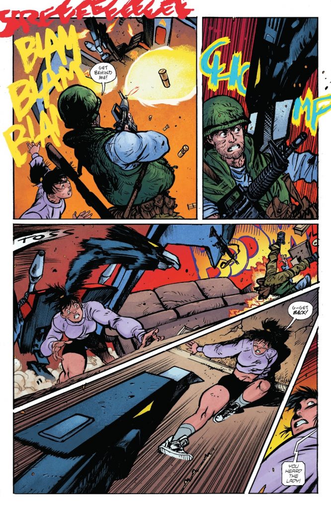 La tropa de Sparky sigue atacando a Optimus y Spike salta a tratar de ayudar a Optimus, y le cae una bala perdida para horror de su padre.