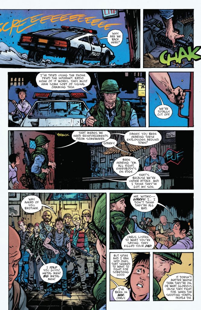 Sparky huye con Carly hasta su viejo bar. Ahí sus amigos veteranos ya está listos para combatir. Carly trata de explicar de nuevo que no todos son malos, pero Sparky le suelta una verdad sobre la guerra “No importa en que equipo estes, ni cuales sean tus ideales. Cuando empiezan a disparar, la gente se muere.”
