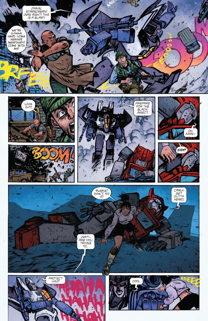Optimus parte raudo con el malherido Spike y su padre, pero Starscream no va a dejarles fácil el escape. El seeker tiene ventaja sobre todo por lo dañado que está Optimus. Se le planta en frente a Prime para disparar a bocajarro, pero Cliffjumper y Carly atropellan a Starscream por la espalda, y lo dejan servido para que el buen Prime le apachurre la cara al pobre Screamer. Pero esto aún no acaba, señores.