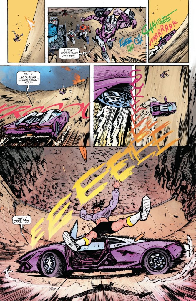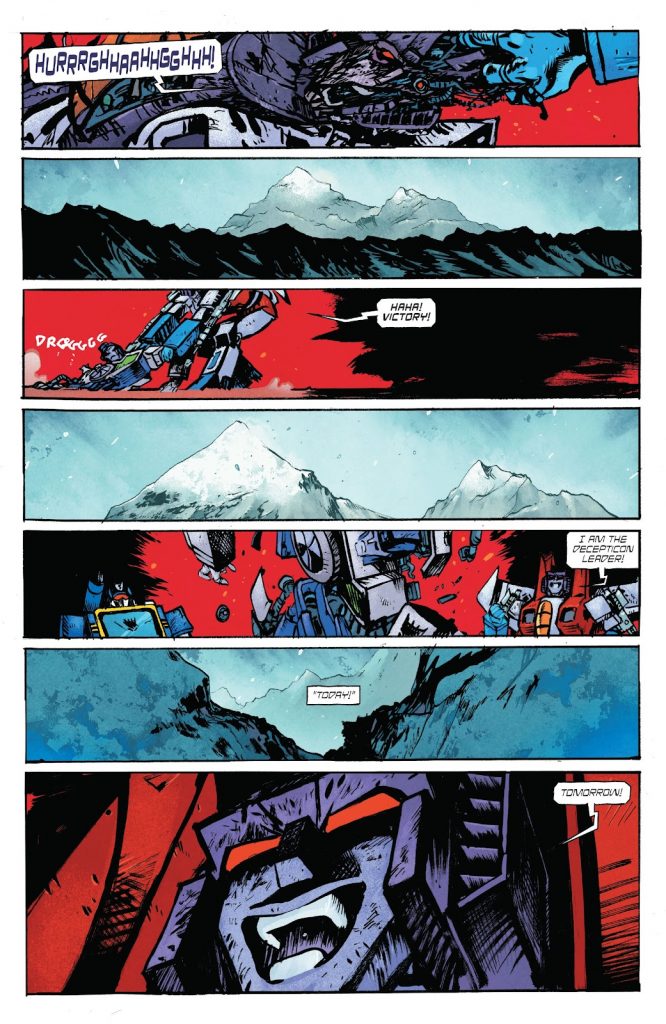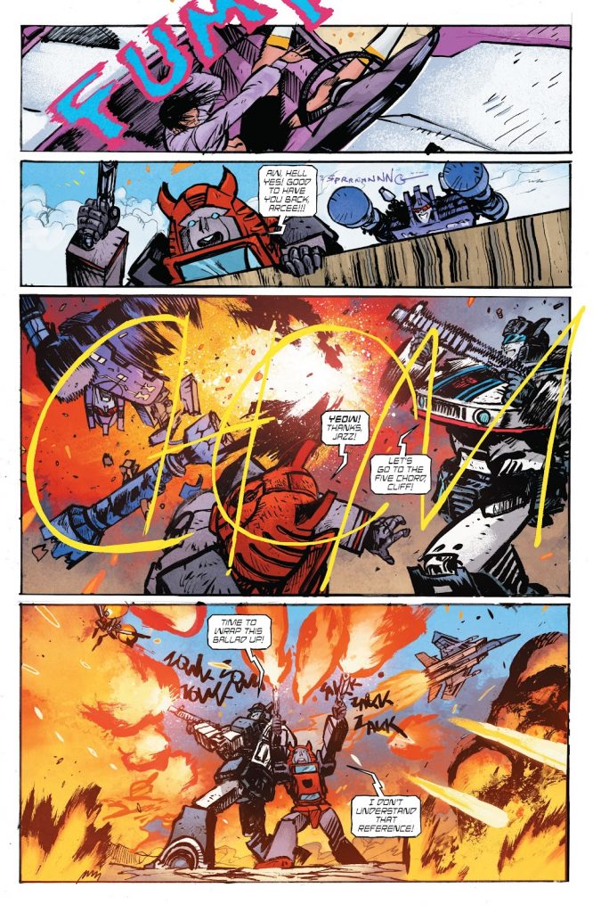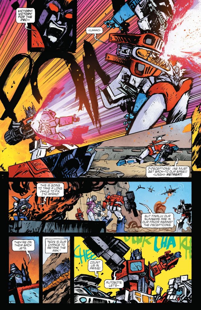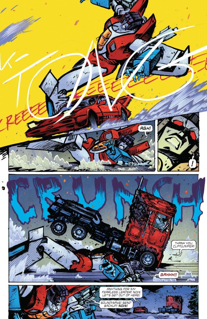 Jetfire trata de detener a Starscream pero es inútil. Screamer le dispara a su propio salvador y está a punto de acabar con Jazz, sino fuera por la aparición de Optimus Prime, con todo y una lariat de la WWF que deja a Starcream en el piso. Spike y Carly siguen sin ser vistos… y bueno, no es que sean amenaza para nadie tampoco.