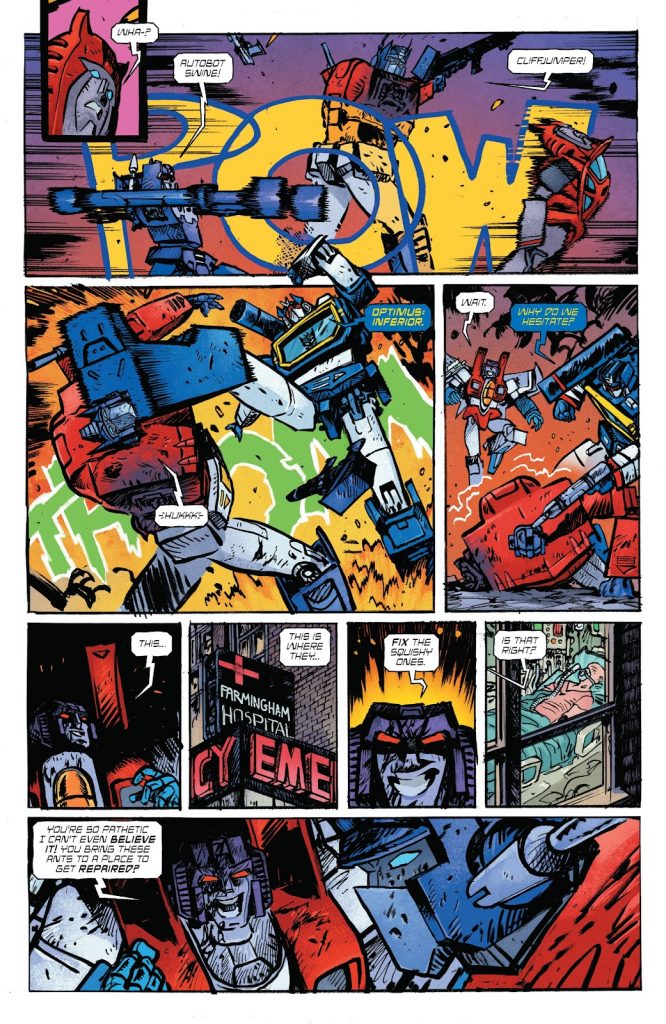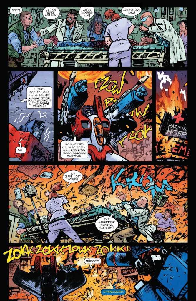 Optimus llega a un hospital donde reciben a Spike con su vida pendiente de un hilo. Starcream llega con refuerzos: Rumble y Soundwave y superan a Optimus y Cliffjumper. Starscream se burla de Optimus por tratar de salvar a una vida humana patética. Se da cuenta que en el hospital “reparan” a los humanos, y para torturar a Prime dispara al hospital causando daños mayores.