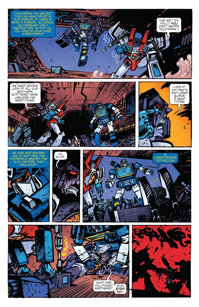 Por otro lado, Teletraan está reparado gracias al “sacrificio” de Skywarp. Soundwave trata de que reparen a su Ravage, pero el espeso de Starscream lo patea, pues dice que hay que empezar con los grandes. Thundercracker es reactivado, y de paso le explica que “oficialmente” Skywarp se sacrificó para la causa Decepticon.