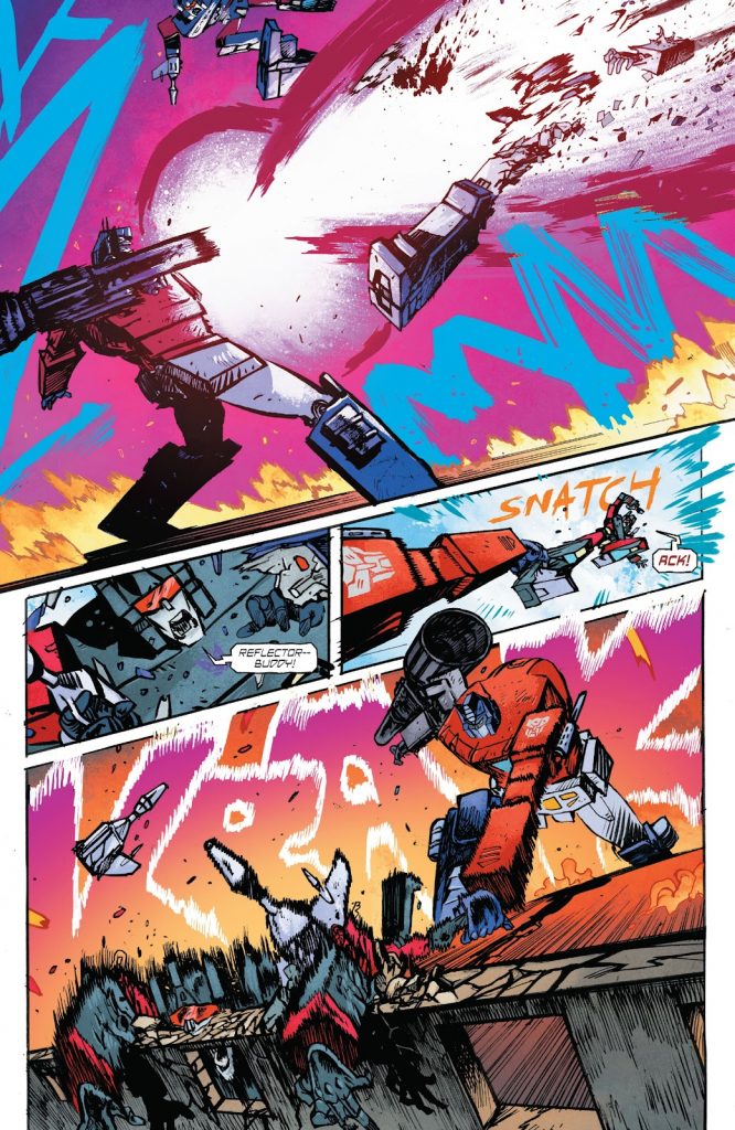 Pero no hay tiempo para más reparaciones. Los Decepticons atacan por sorpresa y nadie está preparado. Reflector se lanza sobre Optimus sólo para enterarse de la peor manera que ahora tiene el cañón de Megatron. Frenzy queda horrorizado al ver los pedazos de la cara de Reflector volando ante él, pero Optimus lo coge y lo usa de trapeador.
