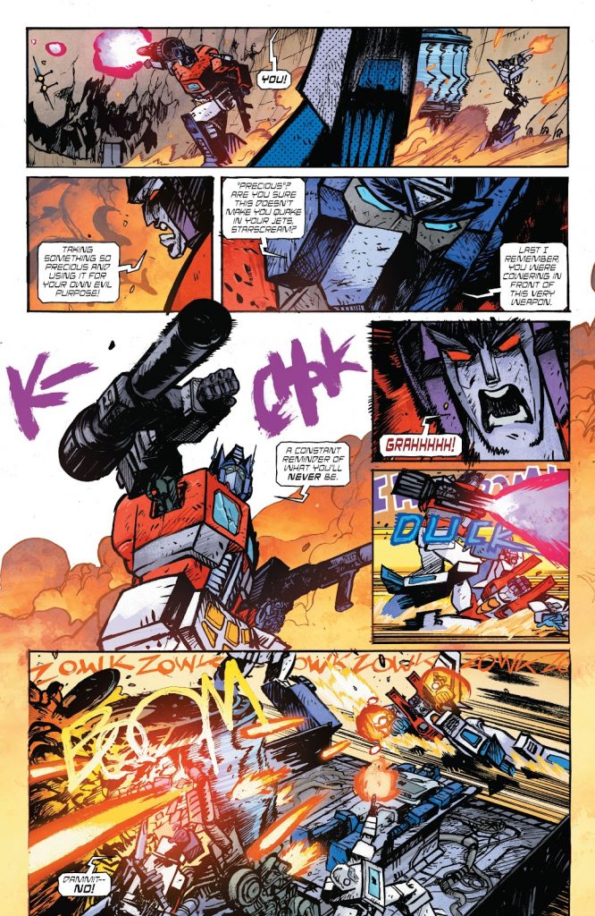 Starscream, teatrero como político nacional, le reclama a Optimus el “haber tomado algo tan precioso para su maléficos propósitos” (mas caradura no puede ser), pero Optimus le recuerda que la última vez lo vio asustado cubriéndose de esa misma arma, que es un recordatorio de lo que nunca podrá ser.