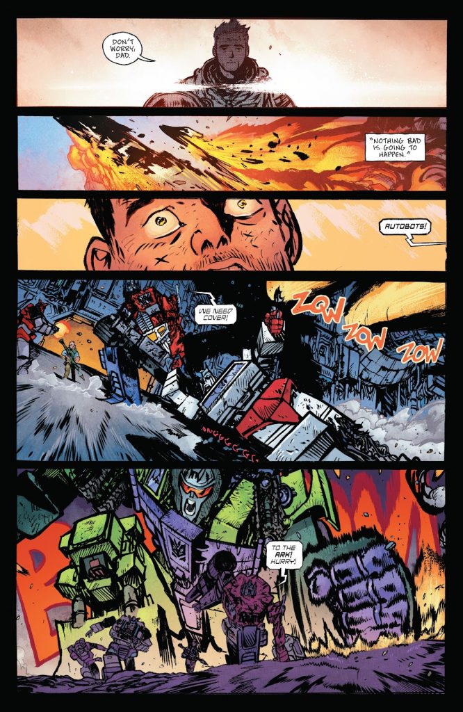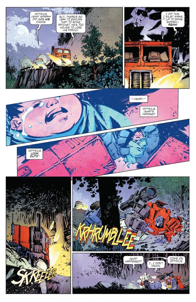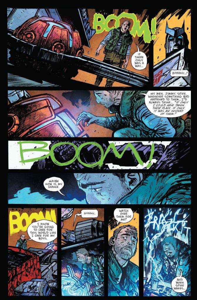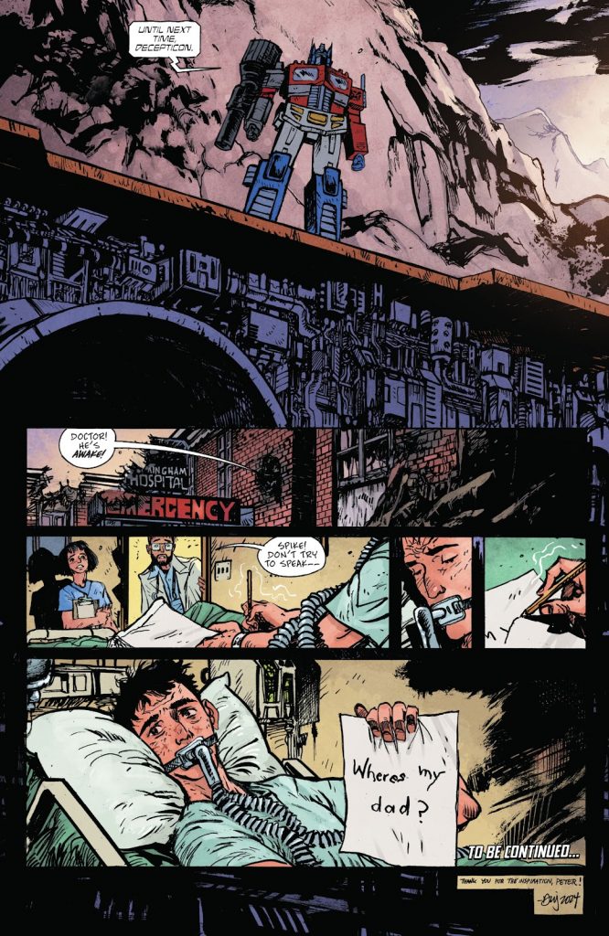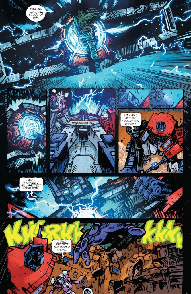 Sparky pide a Optimus que cuide al mundo, y que le digan a Spike lo orgulloso que está de él cuando despierte. Se deja consumir por la Matriz y esta se recarga, reparando a Optimus Prime y dejándolo a su máxima potencia. Optimus le promete que no será olvidado, que protegerá a la tierra y su hijo… empezando con acabar con la monstruosidad que tienen encima. Devastator ha llegado de nuevo.