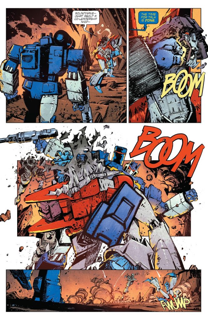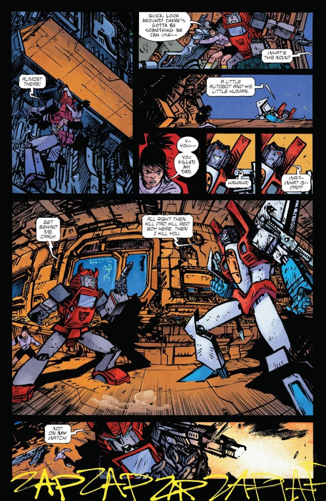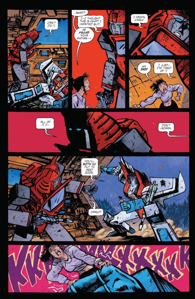 Por otro lado, con un poco de trabajo de equipo y suerte, Carly y Cliffjumper derriban a Starscream. Cliff lo tiene a su merced… listo para vengar a su clan… pero no puede hacerlo. Está harto de tantas muertes, y sabe que matar a Starscream no solucionará nada. Todo para horror e indignación de Carly.