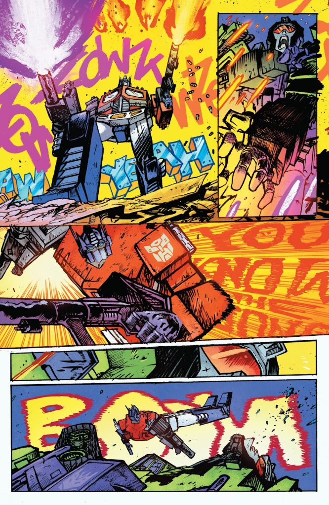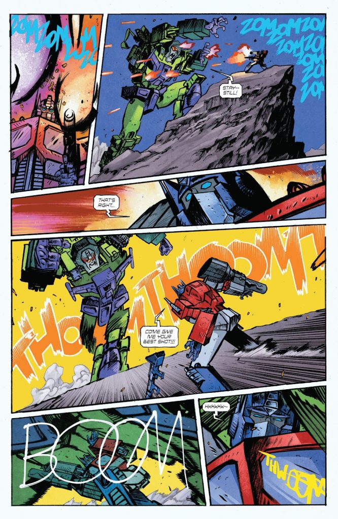 Y vemos finalmente a Prime en su prime. Le plata cara al mismo Devastator que lo había vapuleado hace unos instantes. Todo con un genial panel de fondo que dice “YOU KNOW THE SONG / TÚ SABES LA CANCIÓN”. ¡ÉPICO!