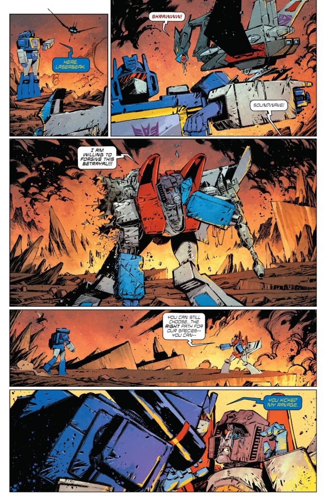 Para nadie es sorpresa quién es el vencedor. Tuerto, sin un brazo y ala, sin armas funcionales… Starscream trata de meterle sentimiento a Soundwave “por la causa Decepticon”… pero este le recuerda que….