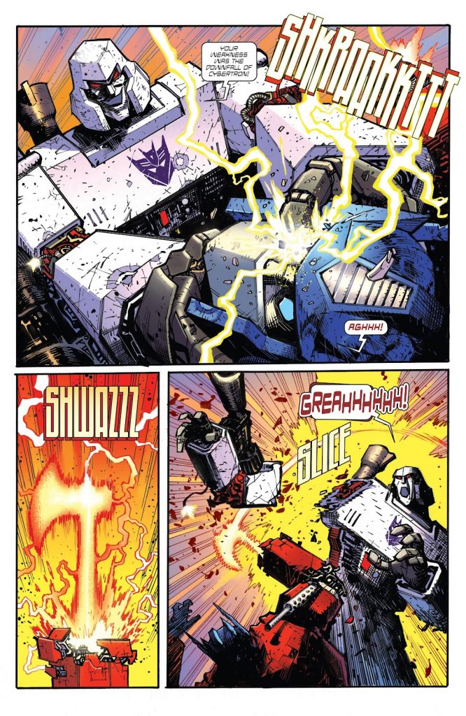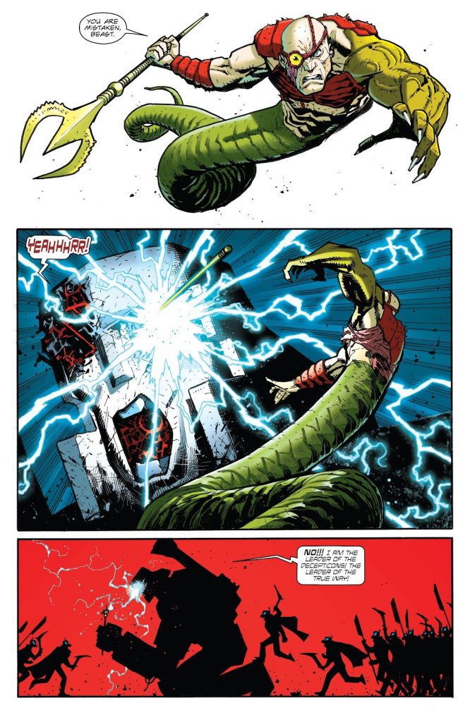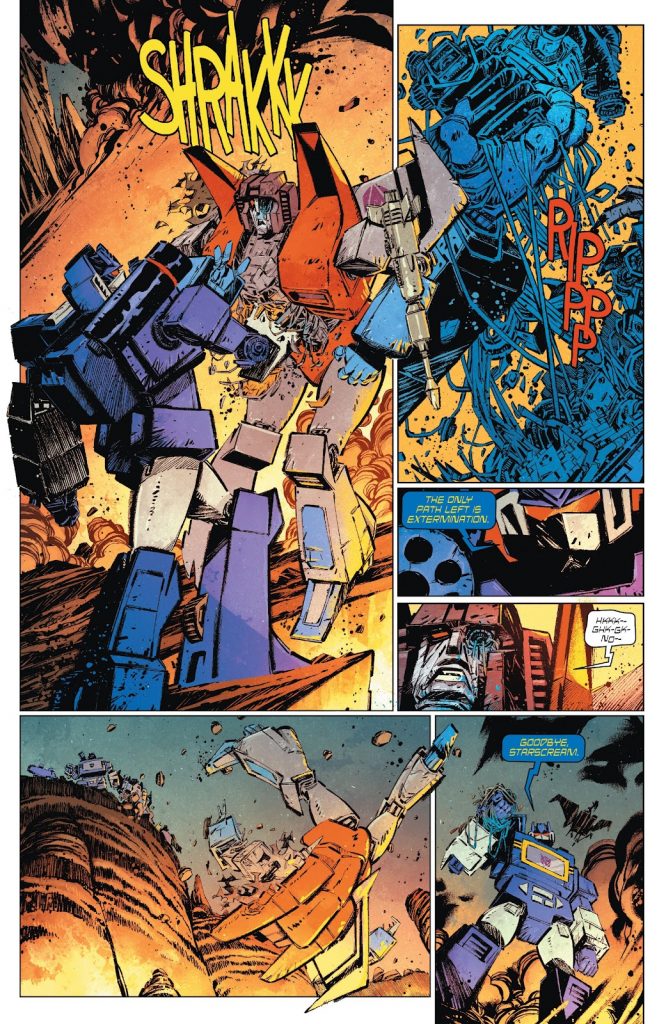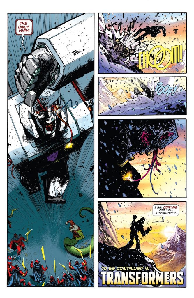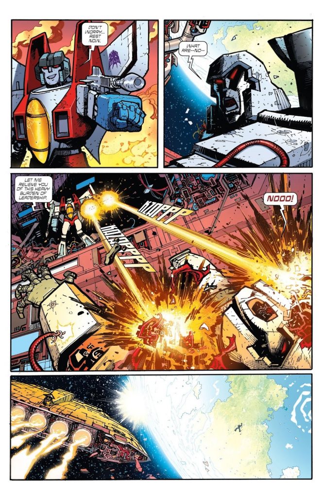 Dicho esto, atraviesa a Starscream, le arranca parte de sus componentes internos, y lo deja caer al vacío. Los Decepticons juran lealtad a su nuevo líder.
