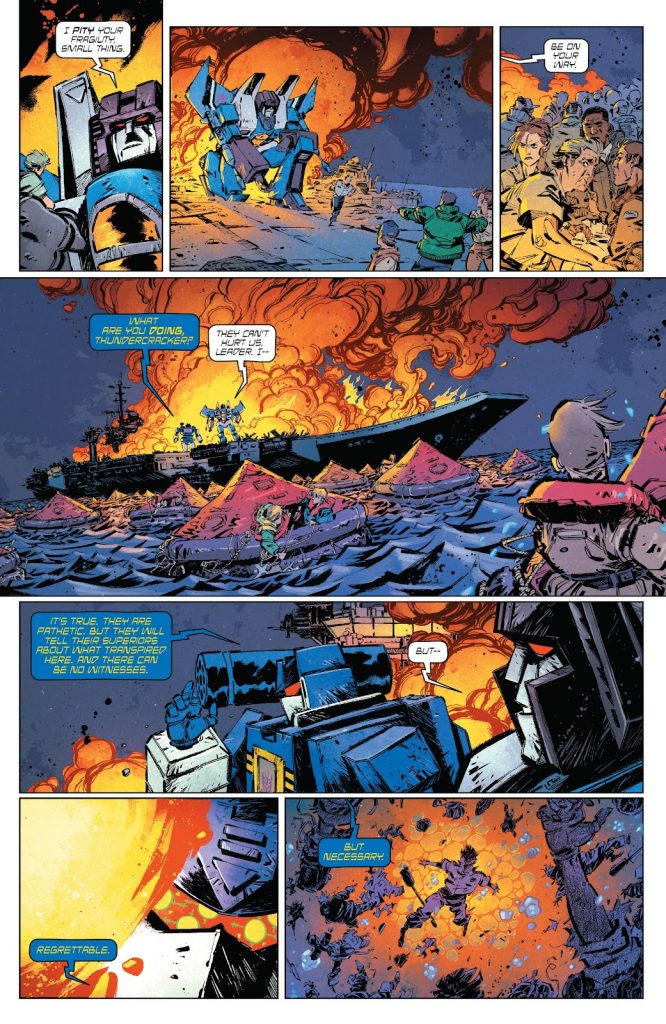 Thundercracker no encuentra honor ni gloria en acabar con enemigos tan frágiles. Deja ir a los pocos sobrevivientes, pero Soundwave le recuerda que su próximo plan requiere que no se sepa de ellos aún. No debe haber testigos. Así, procede fríamente a rematar a todos los sobrevivientes y enviarlos al fondo del fondo del mar.
