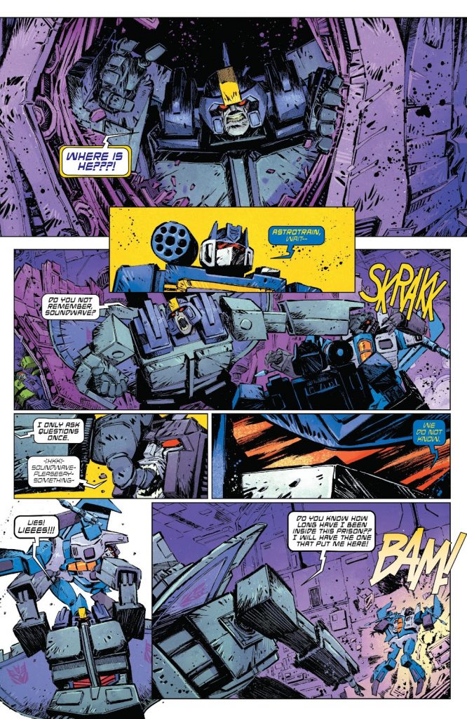 Soundwave ni se inmuta. Le dice que no sabe donde está el que busca, pero que para cuando todo acabe… le entregará a Megatron. Astrotrain se calma, y Soundwave le dice que ahora tiene una misión para él.