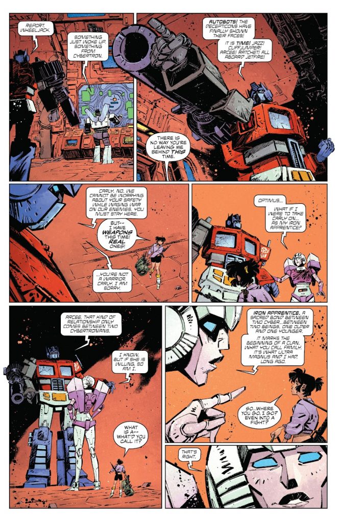 Luego unas muy oportunas casualidades, logran que Skywarp/Teletraan repare a Wheeljack. Detectan el movimiento de los Decepticons y Optimus decide atacarlos. Carly llega cargada de armas, decidida a seguir su venganza personal contra los Decepticons. Optimus se opene, pero Arcee sale a defenderla, y pide adoptarla como su “Iron Apprentice”.