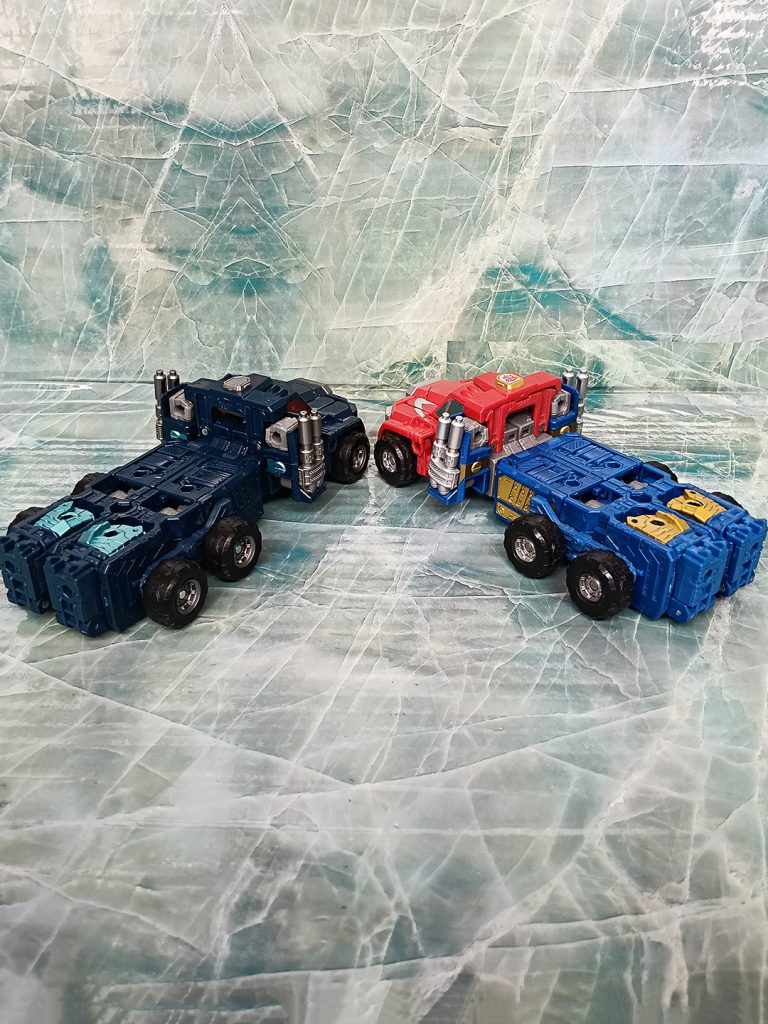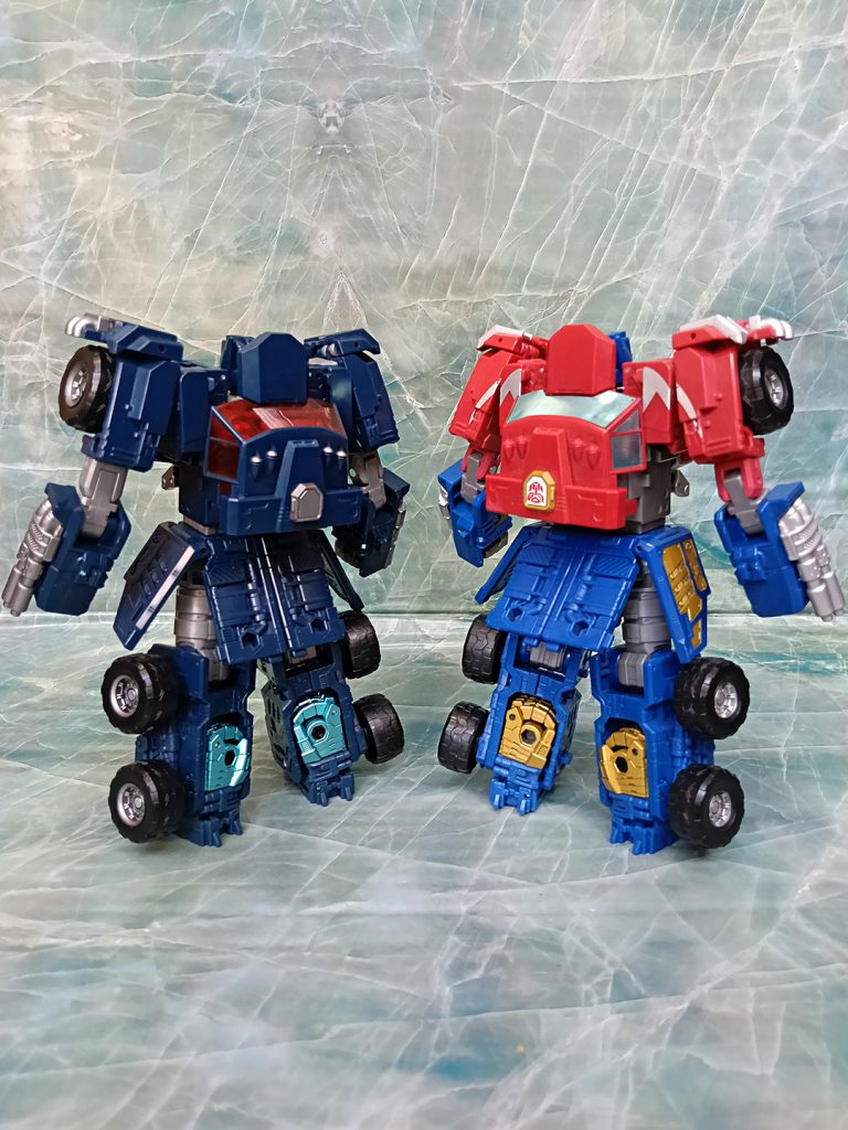 Lado a lado vemos el cambio de colores. Hago notar que mi Legacy Armada Prime tiene aplicaciones de Reprolabels Toyhax. Nemesis pierde algunos detalles en negro y dorado, pero gana aplicaciones de turquesa, y reemplaza el amarillo del pecho por rojo pasión. De espaldas vemos el segundo remolde que tiene. La placa que tiene el emblema Autobot en la espalda del Armada Prime, ahora es una pieza plana sin emblemas.