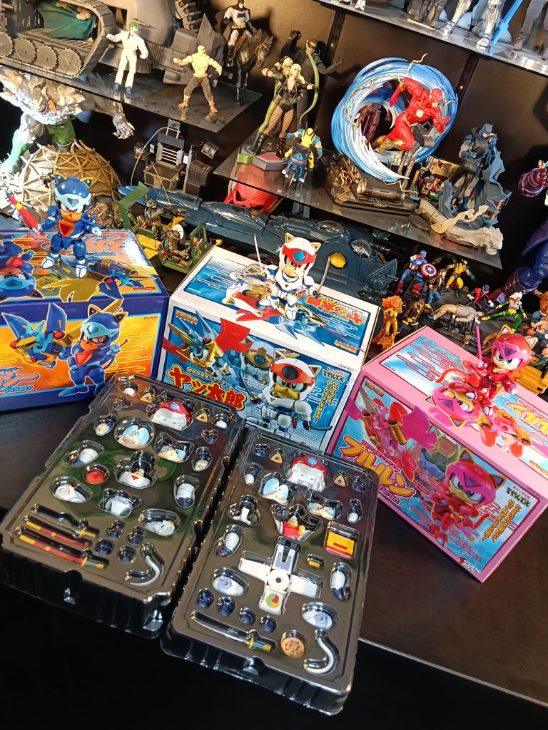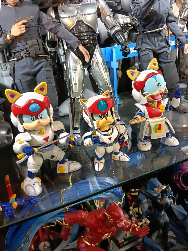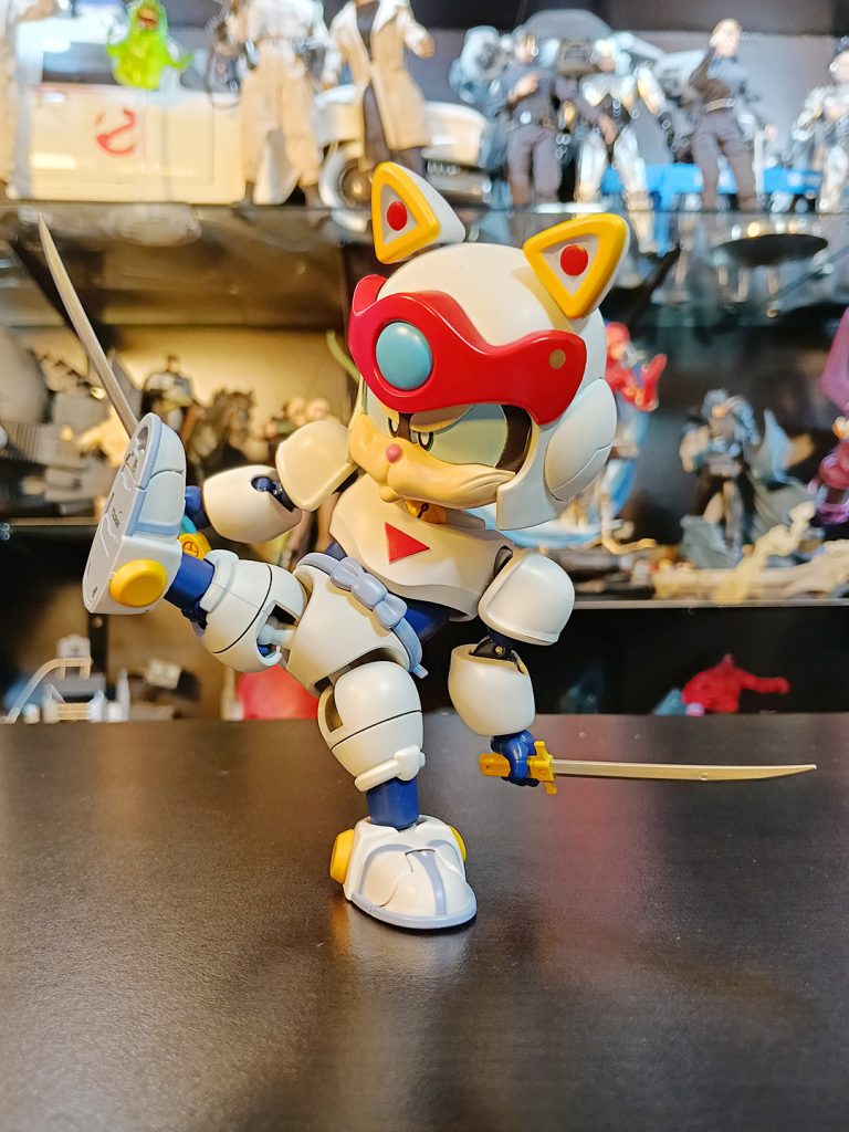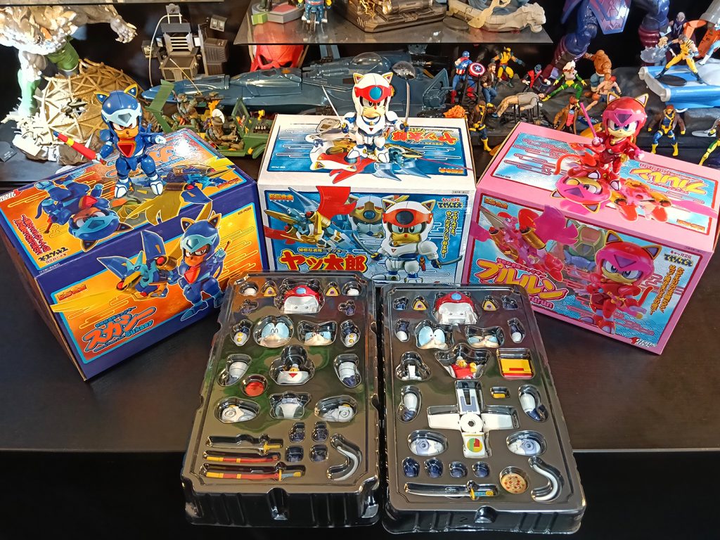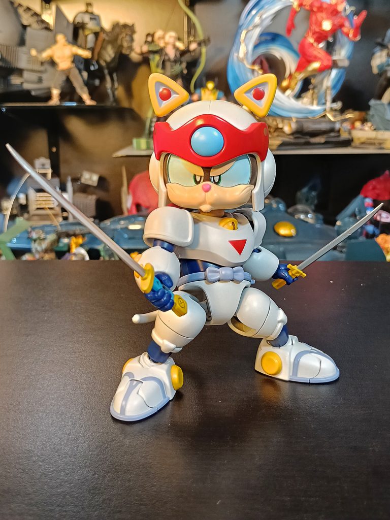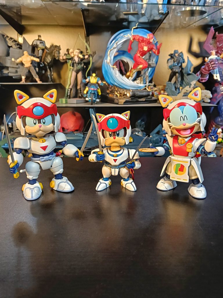 Lastimosamente, no existen muchas figuras de acción de los Gatos Samurai en el mercado. Unas de las más recordadas son los ES Gokin de Action Toys ahce ya 11 o 12 años. Estos venían en su traje de batalla, y con piezas para formar su armadura del final de la serie. La posabilidad es limitada para figuras actuales, pero era lo que había.