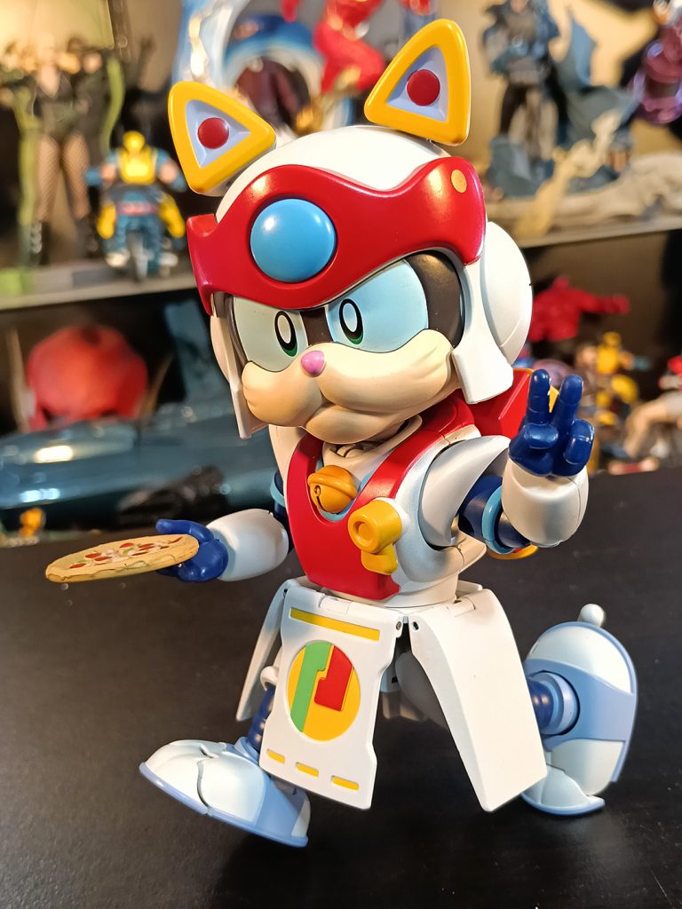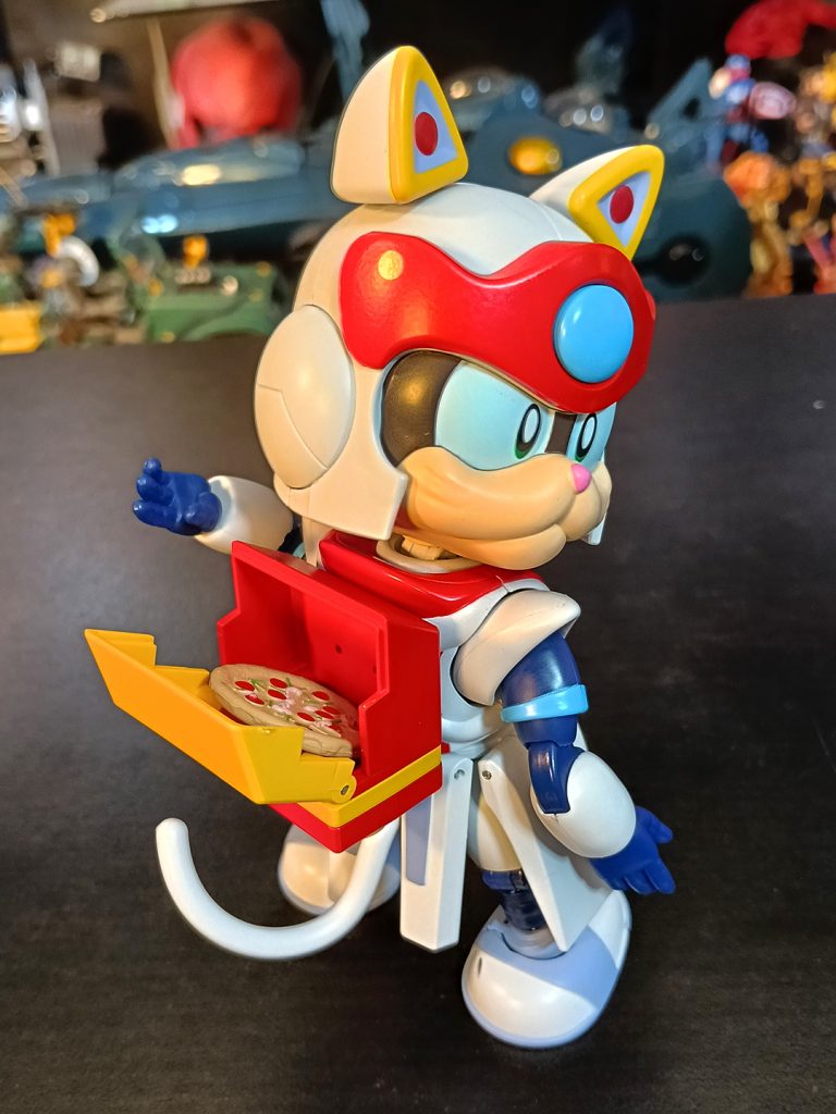 Speedy es muy estable pues las articulaciones de las piernas son fuertes y es zapatón. Como accesorios trae la infaltable pizza y su mochila de delivery, que se puede abrir para poner ahí la pizza. La maleta es removible, y viene una pieza extra para tapar los conectores y se vea natural cuando no queramos ponerle la mochilita.