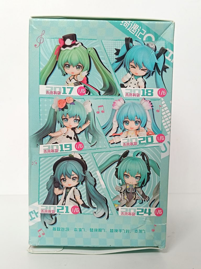 Ya que son cajas “a la suerte”, todas son iguales. Tenemos arte de la “Miku With You 2021”, algunas indicaciones del contenido, e imágenes de la colección con las versiones de los años 2017, 2018, 2020, 2021, y un salto al 2024 (la versión 2025 salió en como figura completa para Fantastic Series). 6 figuritas para coleccionar.
