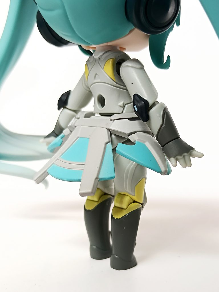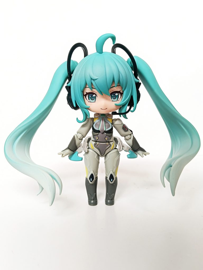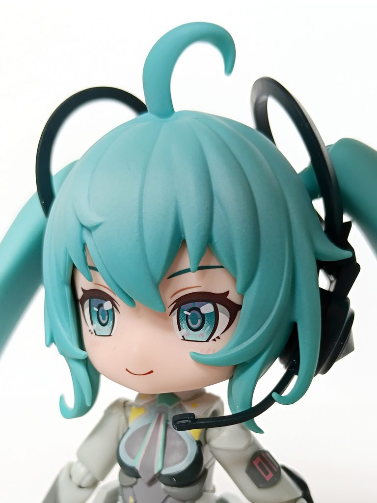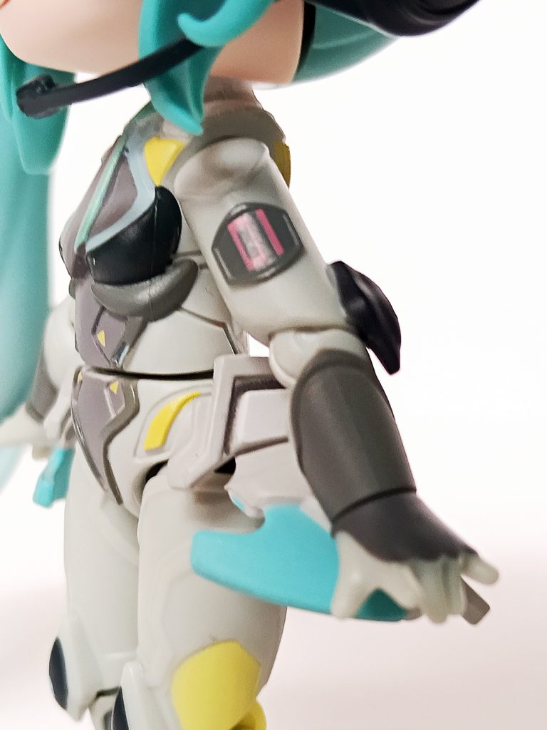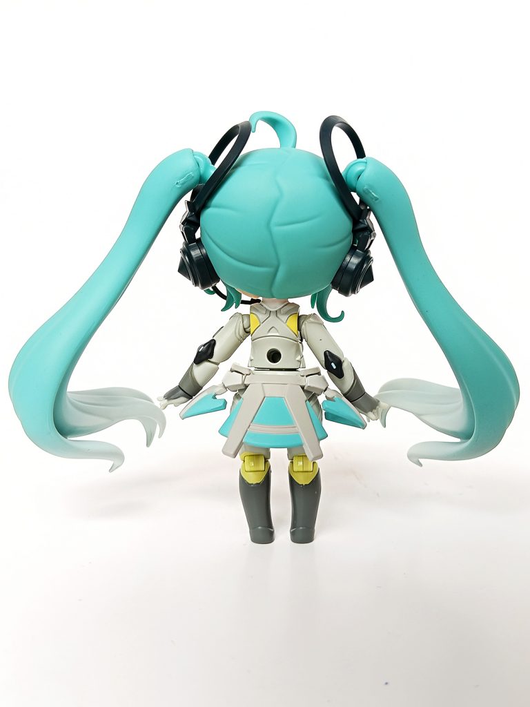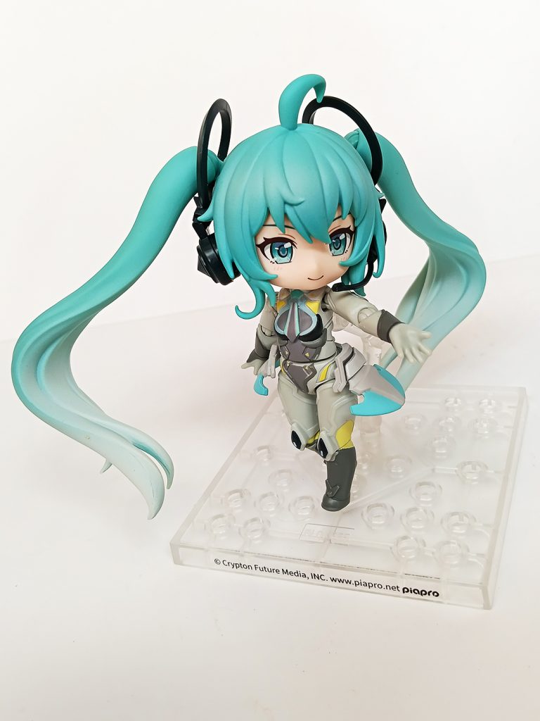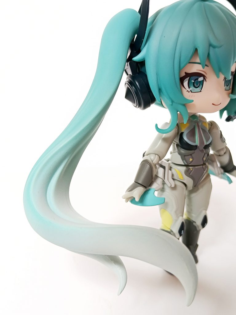 La figura tiene muchos detalles en relieve, no sólo pintados. Los ojos muy detallados y su cabello con su “ahoge” (ese mechón alzado, muy típico del anime), las coletas con degradado de turquesa a blanco y sus nuevos aros, el icónico “01” del hombro en alto relieve. La verdad que no parece que fuera una figura de sólo 7 cm de alto.