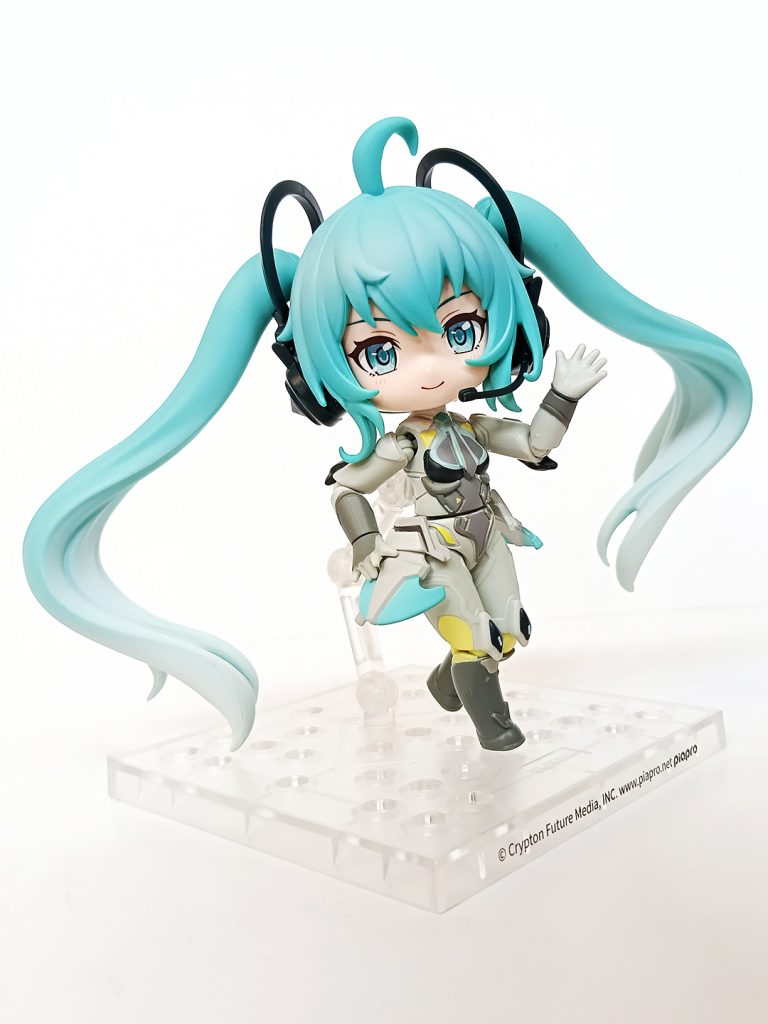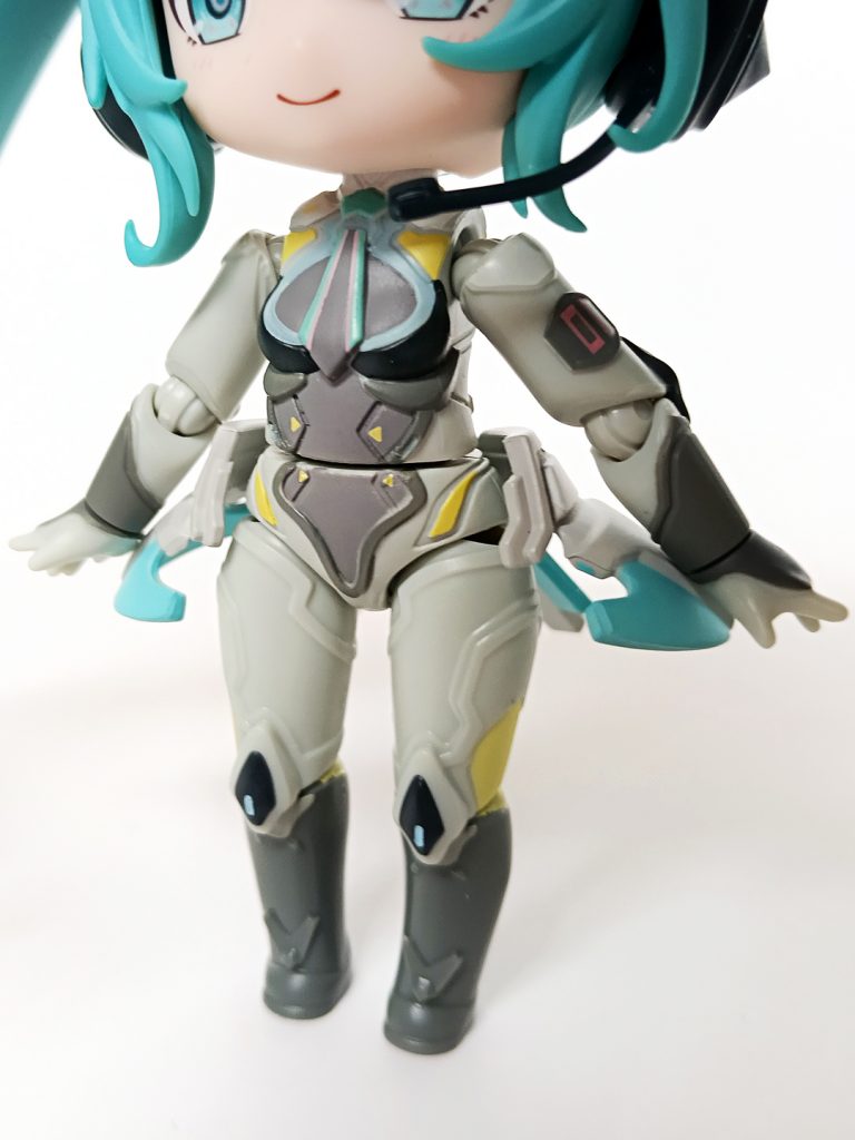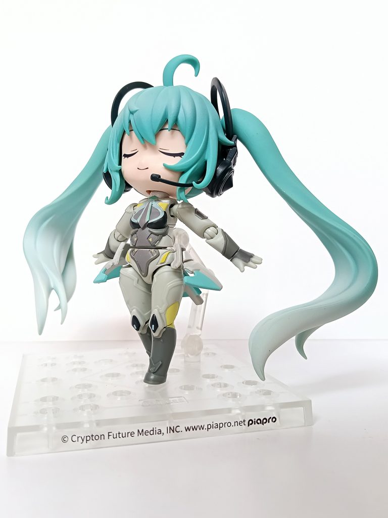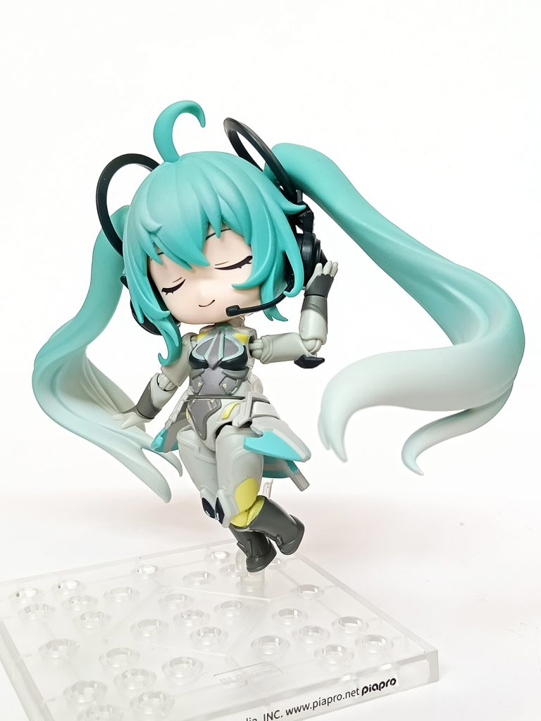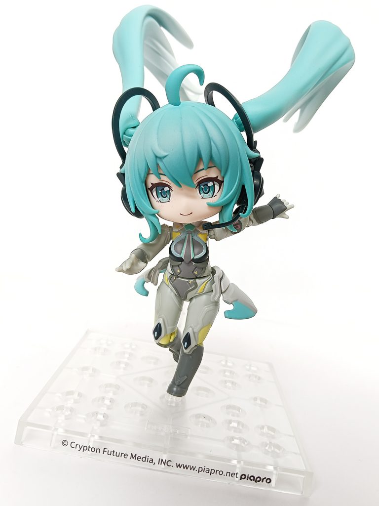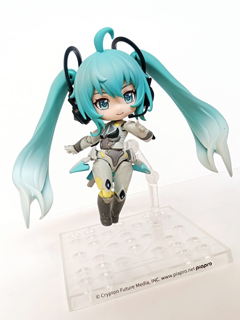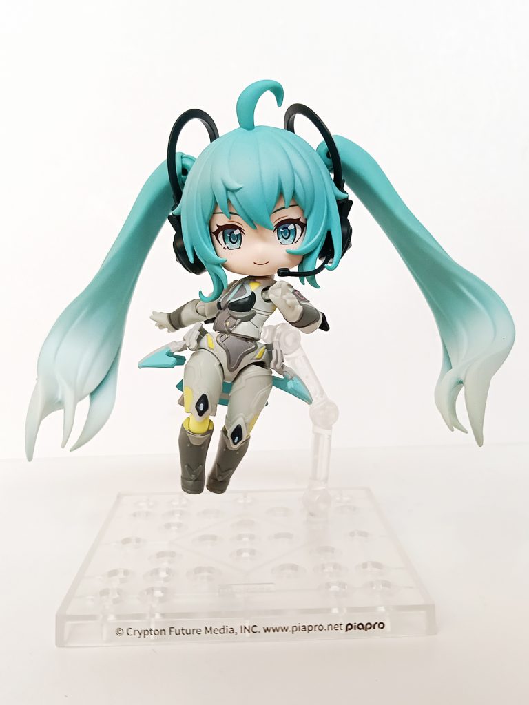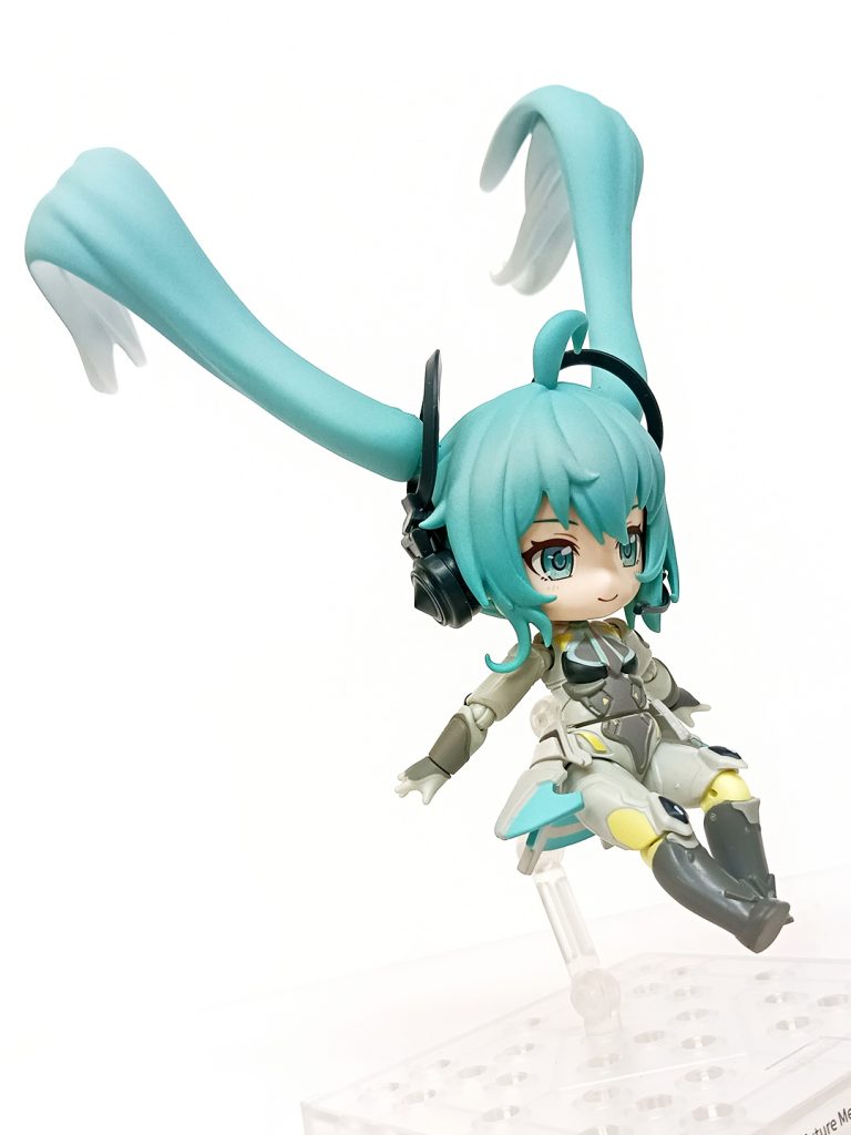 La figura tiene muchos detalles en relieve, no sólo pintados. Los ojos muy detallados y su cabello con su “ahoge” (ese mechón alzado, muy típico del anime), las coletas con degradado de turquesa a blanco y sus nuevos aros, el icónico “01” del hombro en alto relieve. La verdad que no parece que fuera una figura de sólo 7 cm de alto.